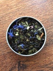 The base of the tea is a very rich black with some slight astringency in the aftertaste. Touches of bergamot play across the tongue, but it is not strong or overwhelming (which is actually surprising to me; there is a lot of other flavor in this tea, and one of my main problems with bergamot is that in most cases, it completely takes over a tea). The bergamot mixes with a strong presence of spearmint, which dominates the forefront of the sip, creating a minty flavor with a slightly citrusy edge, but the finish of the sip is more of a sweeter blueberry flavor; a hint of the blueberry and vanilla flavors come out right at the end, after the stronger mint and bergamot notes have cleared the mouth, and don’t really make themselves known until you notice it there in the aftertaste.